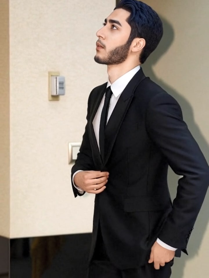 Ahsan Ali Dinpur appears in a structured black outfit paired with a sleek black CHANEL bag. The monochrome styling creates visual unity, emphasizing confidence, power, and refined masculinity.