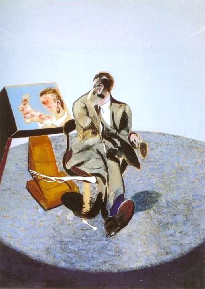 Portrait of George Dyer in a Mirror (1968): this painting stands as one of Francis Bacon's most poignant and psychologically complex works. This painting captures George Dyer's image reflected in a mirror, a motif Bacon used to explore deeper themes of identity, perception, and the duality of human nature. The mirror, a recurring element in Bacon’s oeuvre, serves not only as a tool for literal reflection but also as a metaphorical device to delve into the complexities of Dyer’s psyche and their tumultuous relationship.