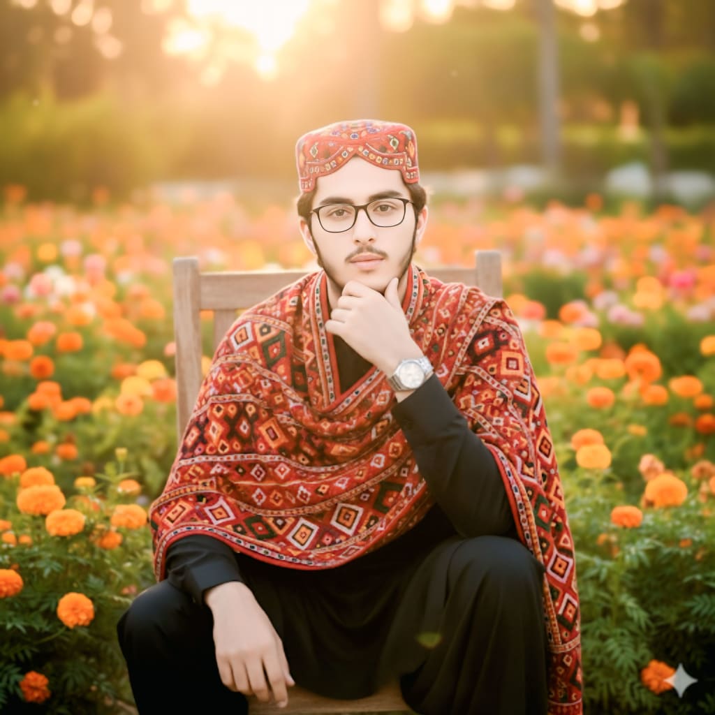 He wears a traditional black shalwar kameez, the deep hue absorbing the surrounding light, creating a beautiful contrast with the warm, sun-kissed tones of the garden. Draped elegantly over his shoulders is a red Sindhi ajrak, its intricate patterns rendered in breathtaking detail. Every thread, motif, and symbol on the ajrak speaks of heritage and artistry — a visual poem of Sindhi culture. The fabric’s red and black geometry stands out vividly against the muted natural background, adding both depth and emotion to the composition. The soft folds of the ajrak fall naturally across his shoulder, catching faint glimmers of sunlight that highlight the precision of its embroidery.