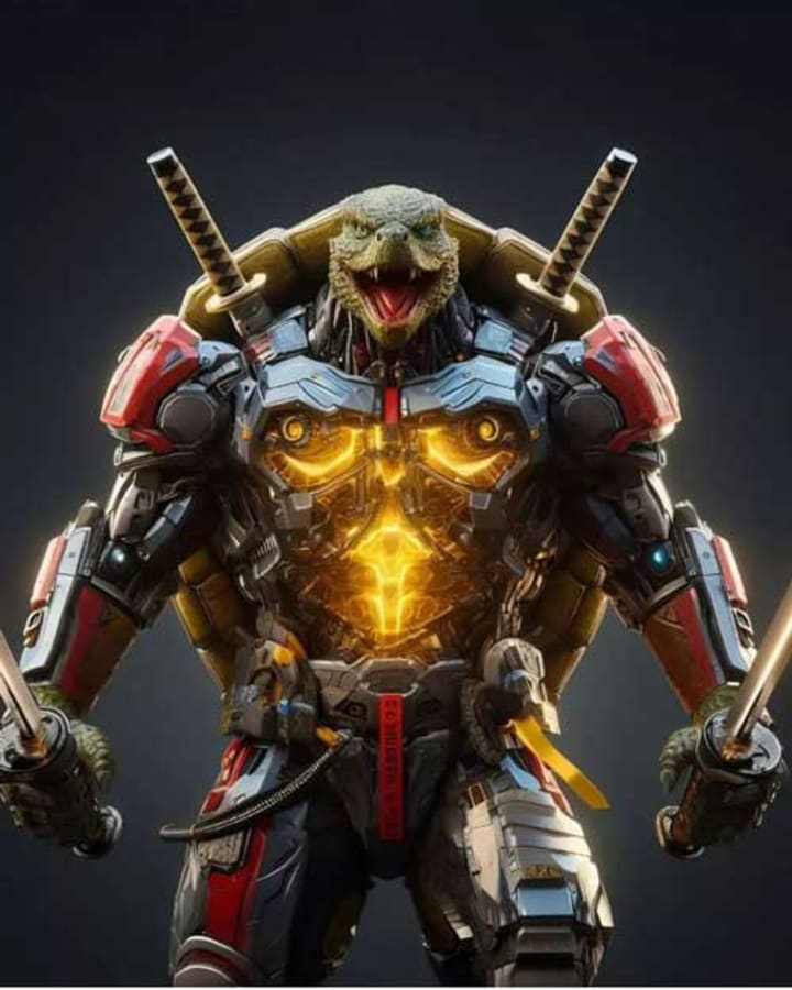 Introducing the Turtle Cyborg, a mesmerizing blend of futuristic technology and ancient resilience. With a sleek, metallic body adorned with intricate circuitry, this cybernetic marvel stands tall, its head proudly bearing the unmistakable features of a wise and ancient turtle.