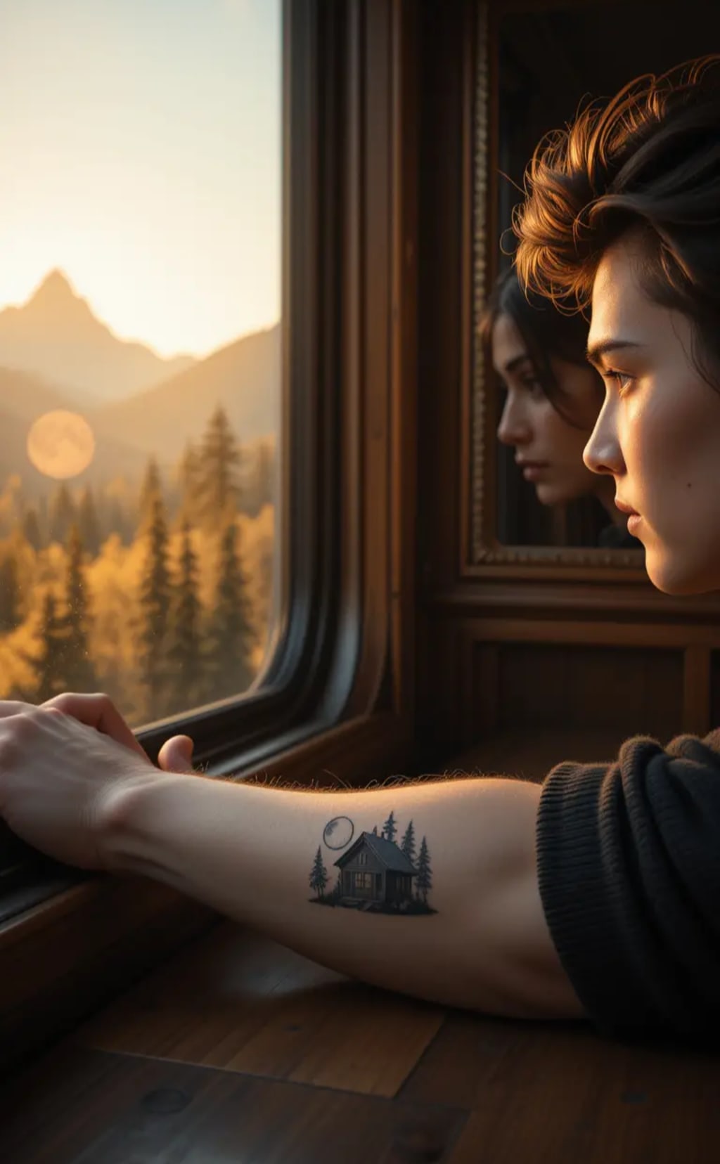 It wrapped around his forearm like a story in ink. At first glance, it was just art—mountains, a small cabin, a crescent moon overhead. But then I leaned closer, pretending to look out the window. My heart thudded in my chest.