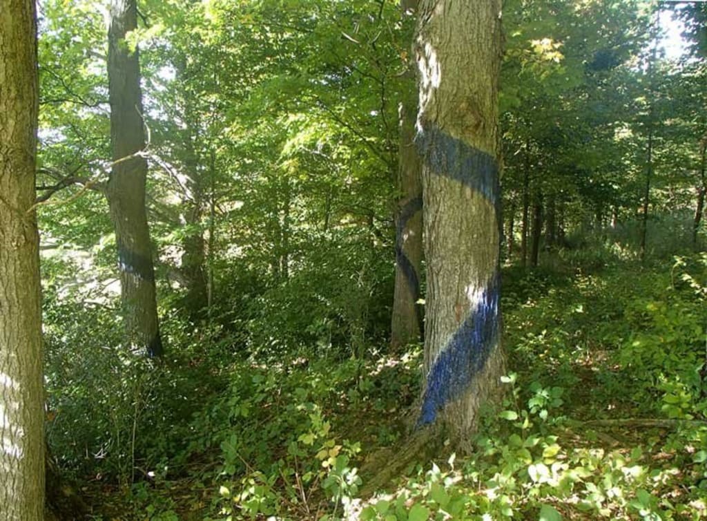 The multifaceted nature of Blued Trees invites a reflection on the intricate interplay between memory and future potential. Every tree, marked with its sinuous blue line, becomes a storyteller. The work weaves together narratives of industrial encroachment with the timeless beauty of nature, suggesting that every mark on a tree is a record of human impact, a ledger of our collective environmental history.