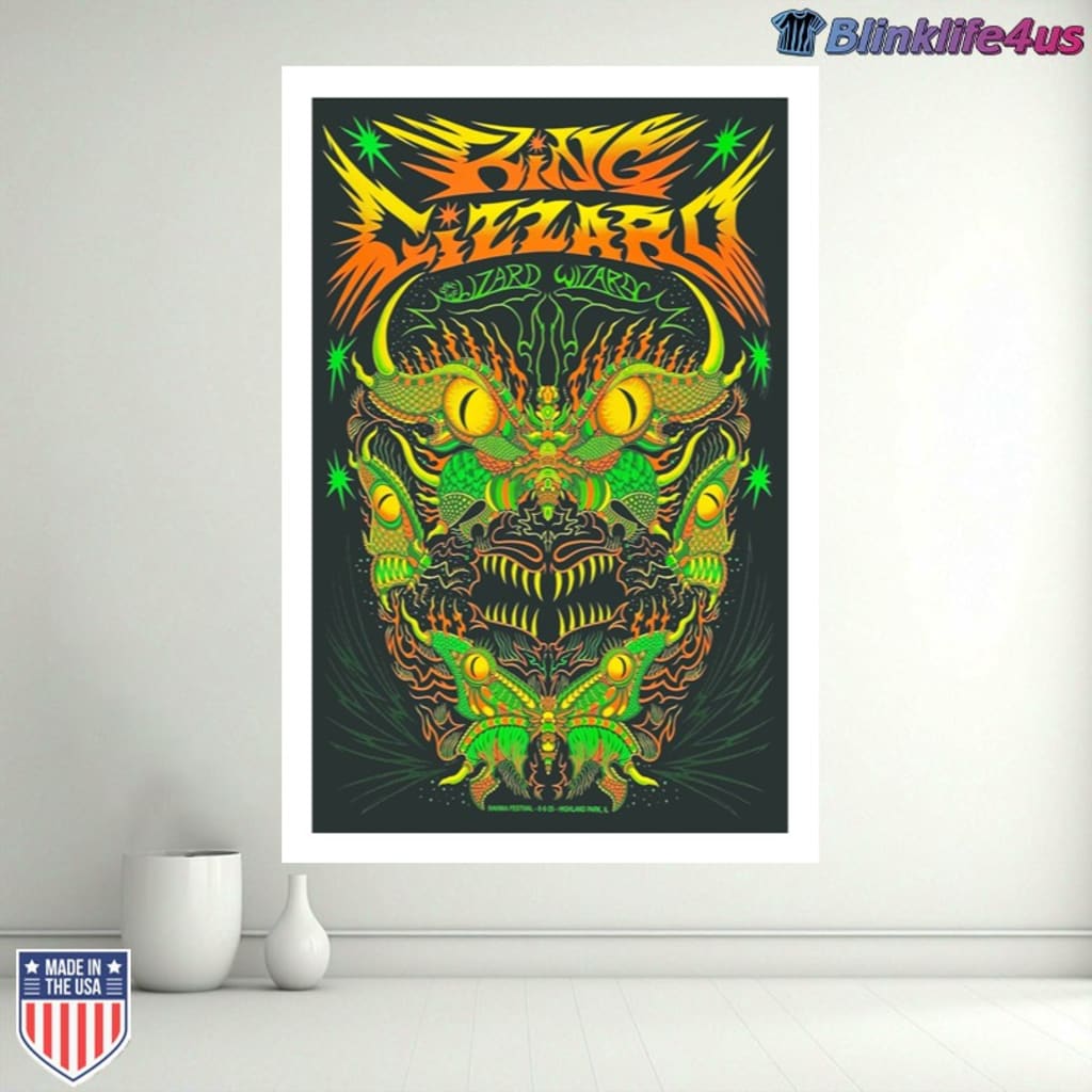 In the vast galaxy of concert poster art, few pieces burn into memory quite like this one. Designed for King Gizzard & the Lizard Wizard’s performance at the Ravinia Festival in Highland Park, Illinois on August 6, 2025, this poster isn’t just promotional—it’s an electric entity, alive with vibrant chaos and otherworldly energy.