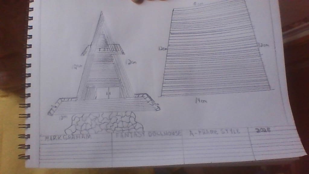 Here is a pictorial sketch of a fantasy dollhouse in the A-Frame style. I drew a stone sidewalk leading to the patio. This house has sliding glass doors, and the patio has a railing on the two sides. This is a drawing of the front and side views. There is a small balcony on the second floor as well as it too has sliding glass doors to the small upstairs room. Please comment and give suggestions.