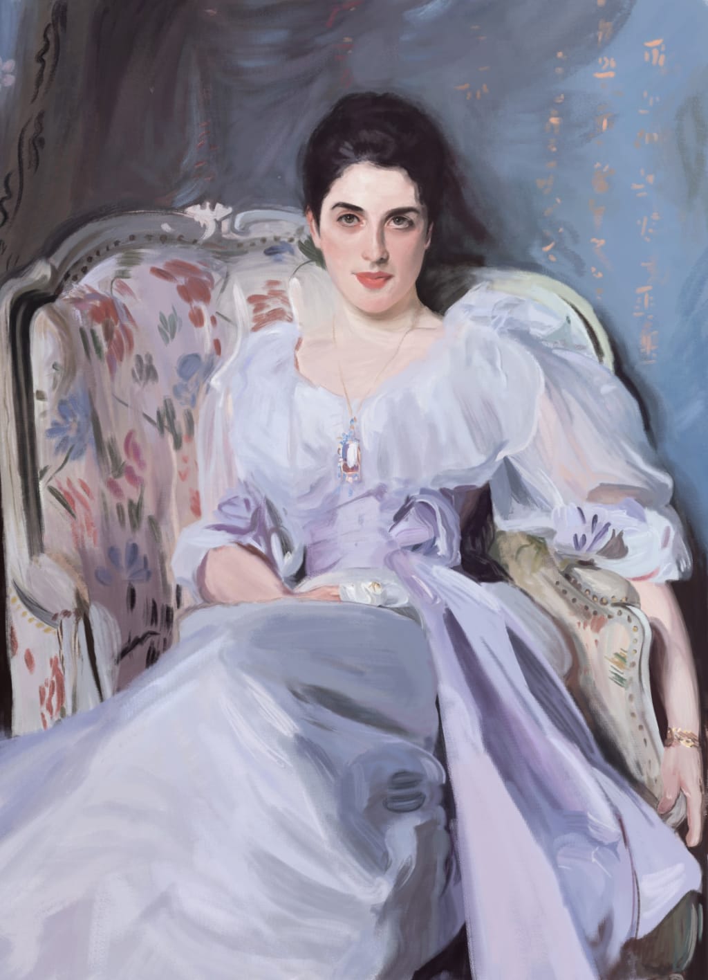 Lady Agnew of Lochnaw was the wife of Sir Andrew Agnew, 9th Baronet. This painting was commissioned in 1892 and painted by Italian-born American portrait artist John Singer Sargent. The Lady was painted in oil on canvas wearing a white gown with lilac accents. Chinese silk wall hangings from the eighteenth century and French chairs are depicted. This artwork was finished in six sessions. In 1893 it was exhibited at the Royal Academy in London, England establishing Lady Agnew as a society hostess and giving the artist the status of portrait painter.