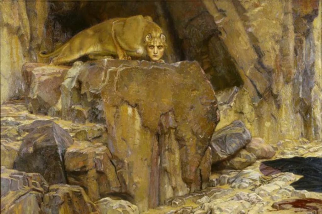 Swedish artist Georg von Rosen enjoyed painting cats and women and was known for his historical paintings and landscapes. During his travels, the painter was particularly interested in The Sphinx in Egypt. It appears it inspired him to create this artwork. The painting depicts a half-cat/half-woman creature. To me it looks like a woman’s head on the body of a leopard.