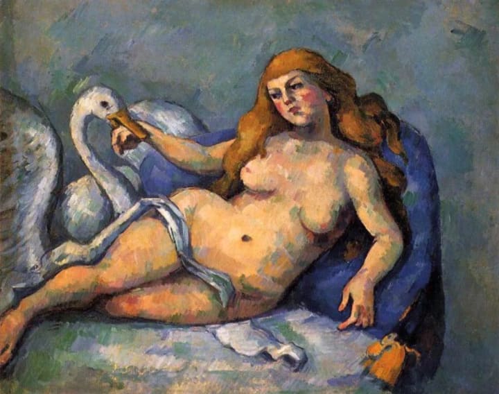 French post-Impressionist artist Paul Cezanne was one of the most influential modern painters. In this artwork, he takes on a mythological subject showing one of the many affairs of the Greek legend Zeus. Zeus turned himself into a swan to seduce Leda, the wife of the Spartan King Tyndarens,