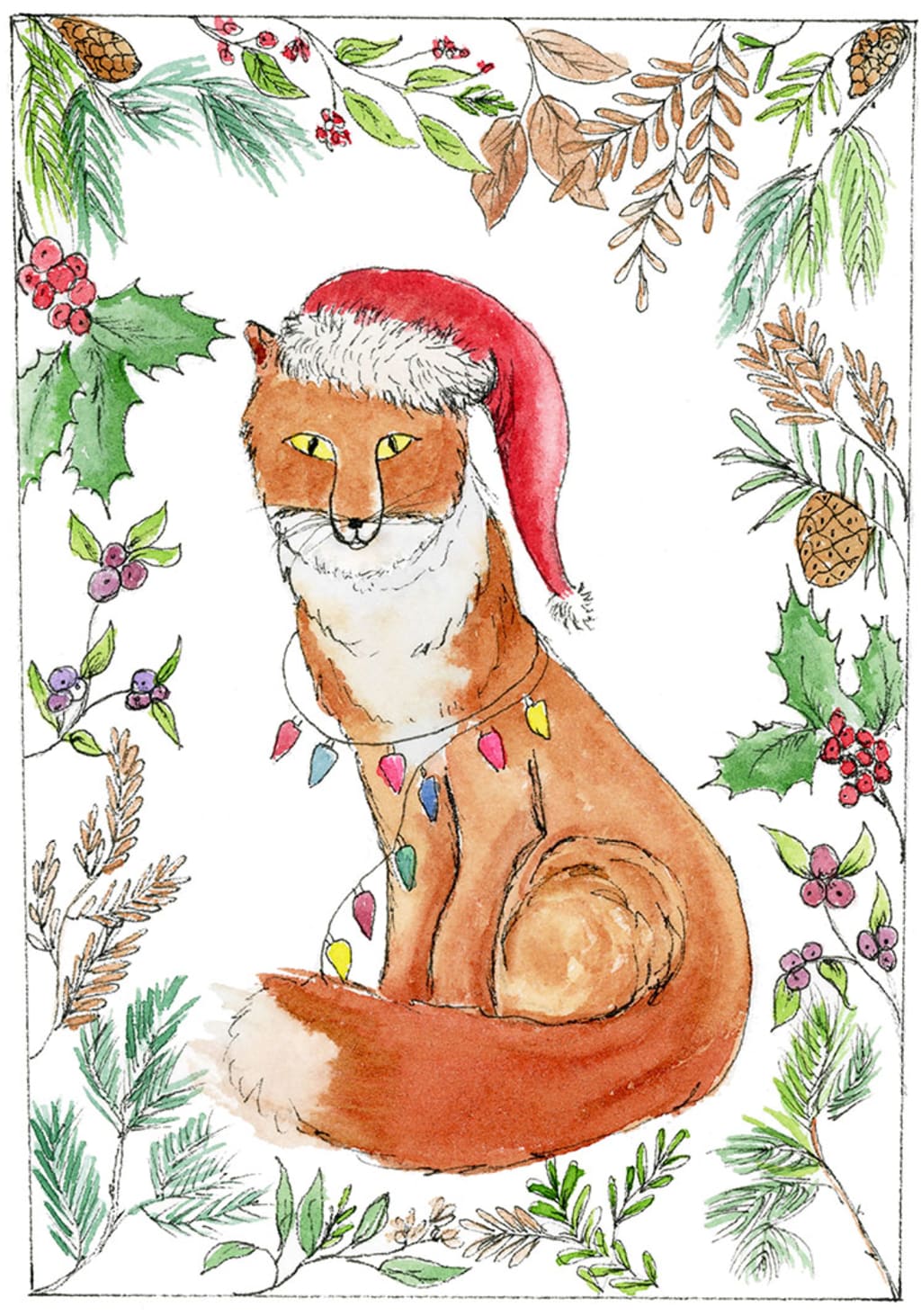 Above is my Christmas Fox, which I illustrated with pen and watercolor. I first inked the fox and allowed it to dry for 24 hours before I painted it with watercolor. Using a Micron pen size 03, I can create finer details that would be a little harder with watercolor. The technique of ink and watercolor is quite trendy these days.
