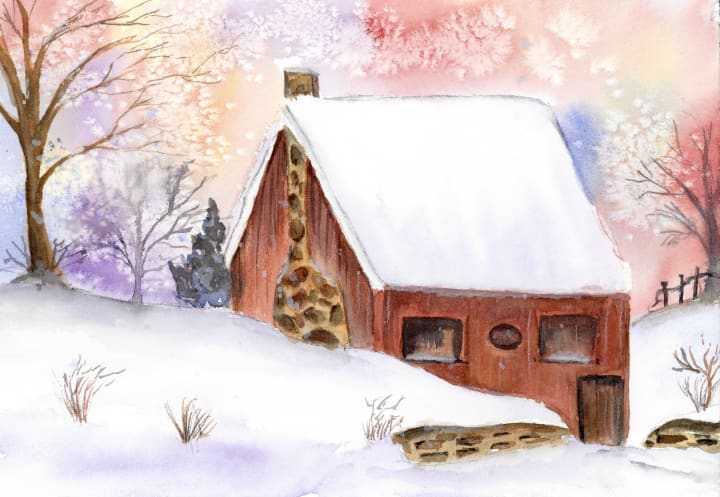 This was nerve-racking to paint as I am not comfortable with wet on wet. For this painting, I used watercolor and salt to create the texture to give the illusion of snowing.