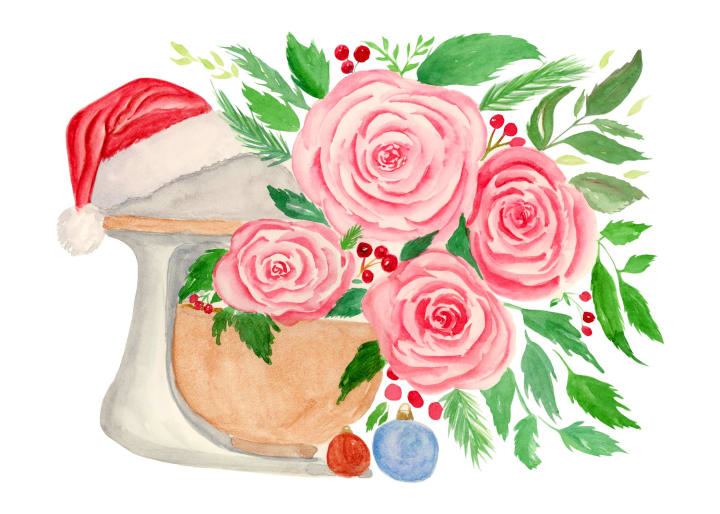 Here is a kitchen mixer wearing a Santa hat with pink roses and holly spilling out of the gold mixing bowl. A pair of Christmas ornaments sit by its side. I came up with this image for "Baked With Love" stickers for my shop. I figured that for all of the home bakers out there during the Christmas season, this picture on a sticker with their name would make a nice touch.