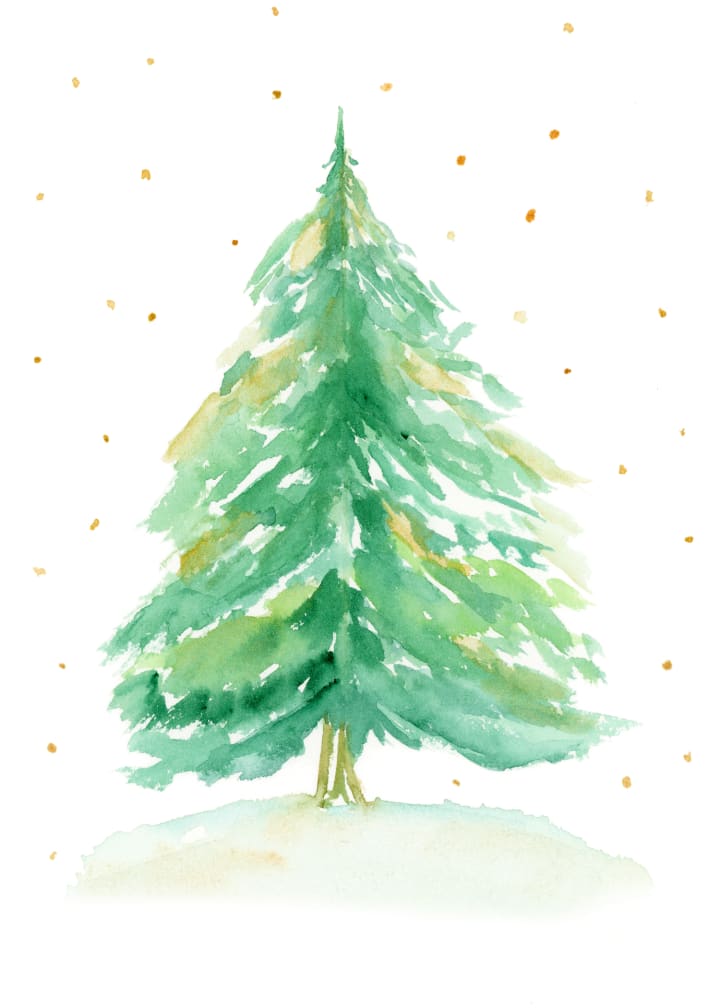 I was aiming for a minimalistic style. This simple yet elegant Christmas tree was first created with simple splatters of sap, emerald green, and gold watercolor paint in the corner of the tree. Then, using a medium-sized brush, I teased out the hues into making long wisps that resembled tree branches. Then, using a diluted version of the greens and golds with a hint of ultramarine blue, I worked on the shadows.