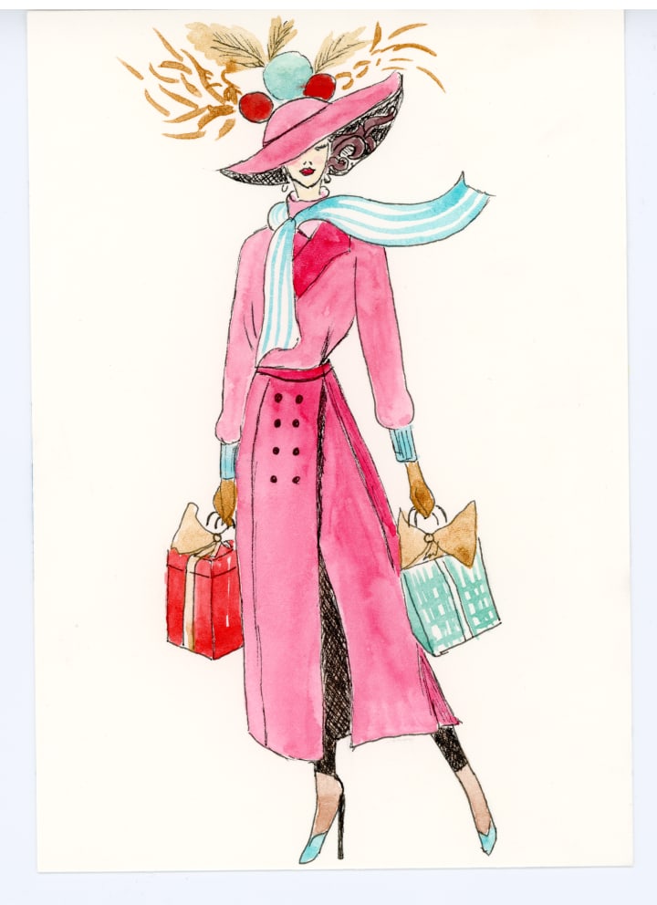 For my final piece, I went back to pen and watercolor. First, I worked on illustrating an elegant woman with gift bags and an ornamental hat. I thought of the women in the 50s walking on Fifth Avenue in New York City. If you are familiar with old Hollywood, Myrna Loy was in a movie called "The Thin Man", with William Powell. It took place during Christmas in New York. She was my inspiration for this illustration.