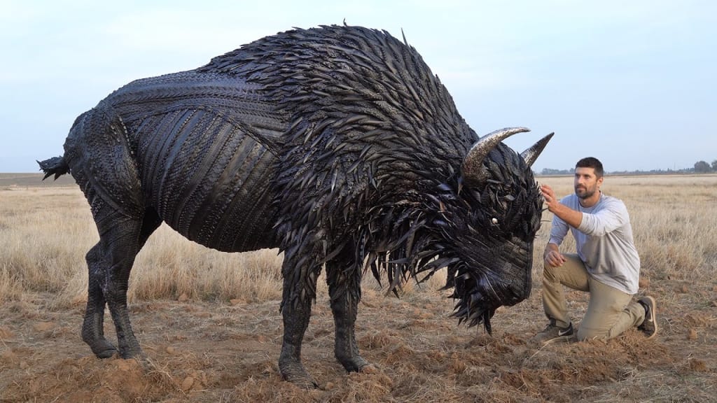 To capture the bison's natural texture, I covered parts of the sculpture with spray foam, which I then coated with thousands of shredded tires to mimic fur. This technique not only added realism but also aligned with my commitment to using recycled materials in my art.