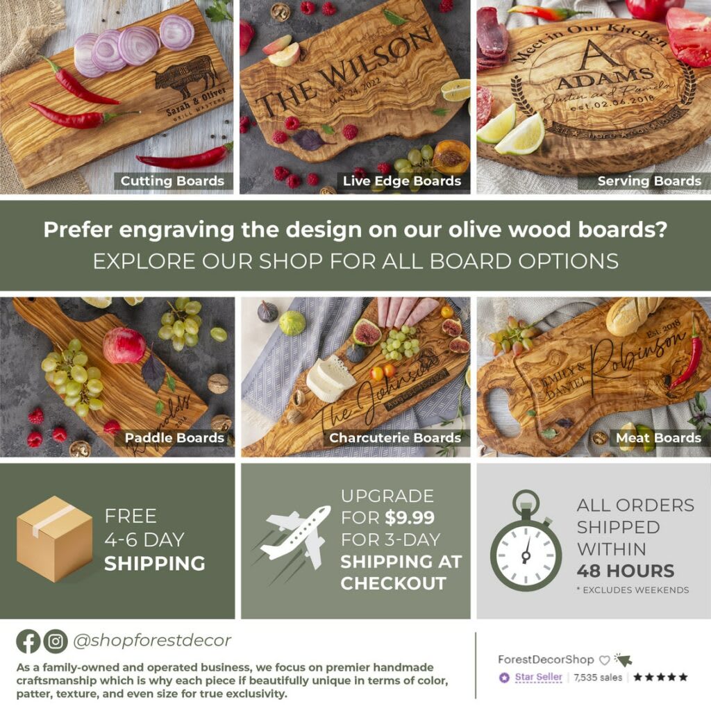 Discover Forest Decor's exquisite hand-crafted wood products, including olive wood cutting board, utensils, rustic novelties, and personalized items. Contact us to reach out directly at (801) 784-848.