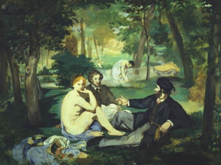 French artist Edouard Manet was a renowned French modernist painter of the 19th century. The artists played a significant role in bridging the gap between Realism and Impressionism. This artwork was created in 1853 and is known in French as Le Dejeuner sur l’herbe. This well-known painting depicts two clothed gentlemen sitting on the grass at a picnic with a nude female sitting with them. She is the only figure sitting on a sheet. Another woman in a white robe can be seen coming out of the water behind the trio in the foreground.