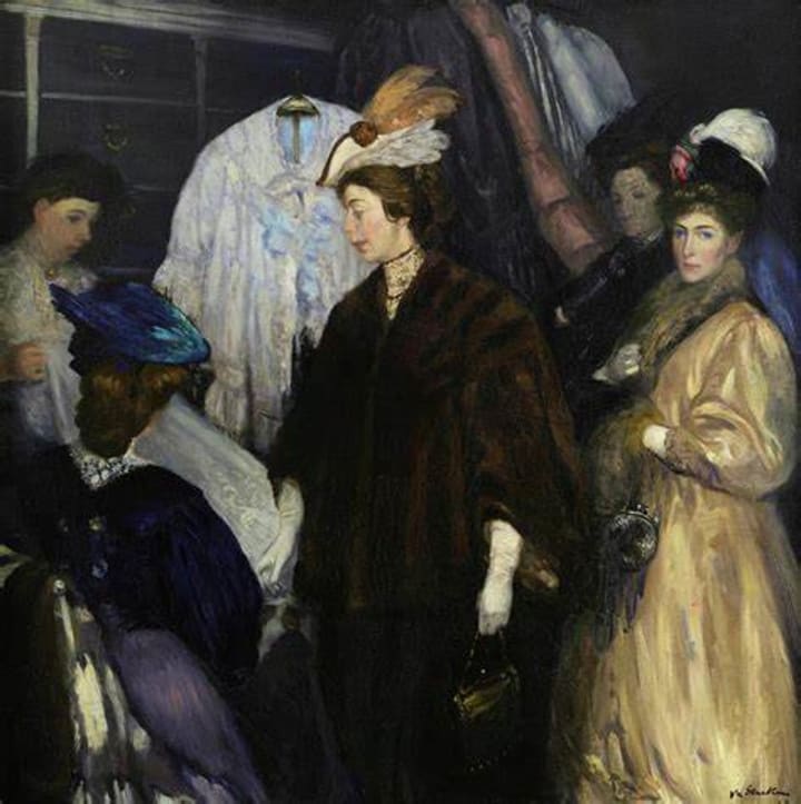 American realist artist William Glackens was a founding member of the Ashcan School of American Art. He created this oil-on-canvas in 1907. This artwork captures middle-class New York life during its time period through urban shopping depicted in realism style.