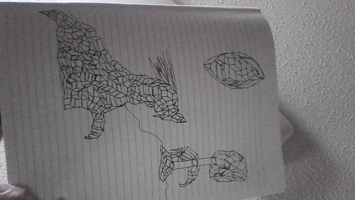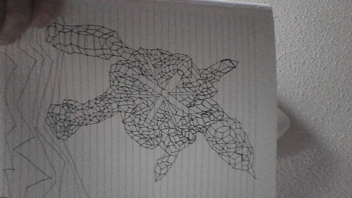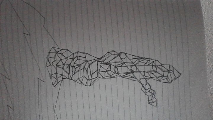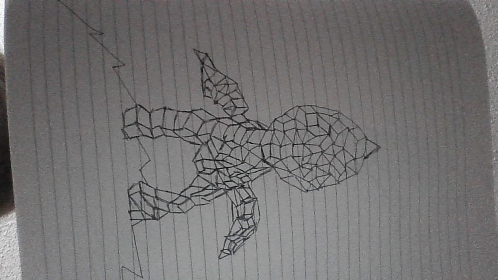 This piece is one of mine well most of my sketches that start out with a cube and working out from that point. In the drawings are also squares and triangles as well. This one could be titled 'alien child' or anything that you think it may be. All of sketches so far have been done on this lined paper. These sketches all started off with me drawing just a regular cube and shooting off from there with triangles and squares and at times in other sketches that I plan to share circles.