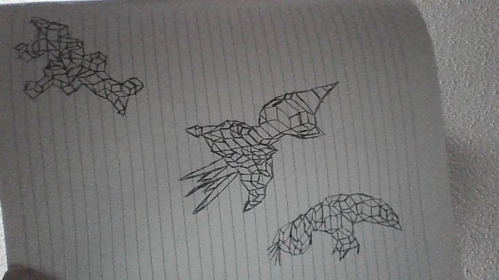 Pardon my fingers I was just holding down the page to get a better picture. This last sketch is one that could be showing the takeoff, the up-close flight and off into the wild blue yonder of a bird of some type.