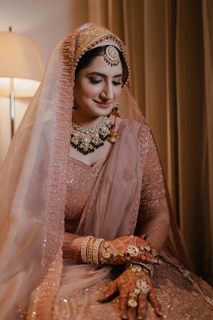 Pro Tip: A full-coverage foundation and golden highlighter enhance the bride’s glow, ensuring a picture-perfect look throughout the wedding festivities.