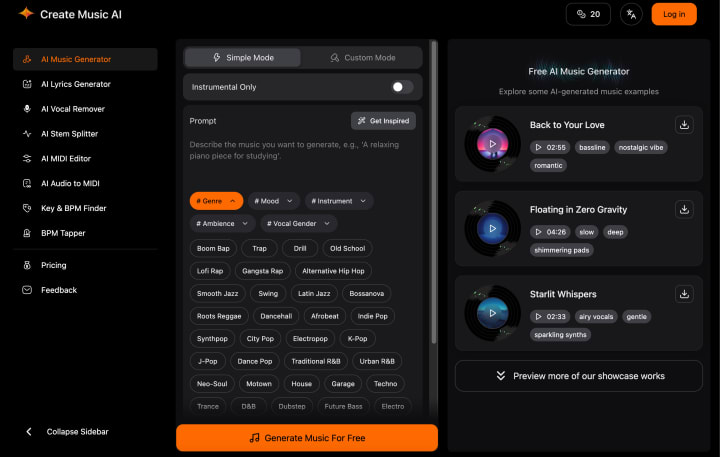 Simple Mode: Perfect for when you need a background lo-fi beat in seconds. You describe the mood, pick a genre, and hit generate.