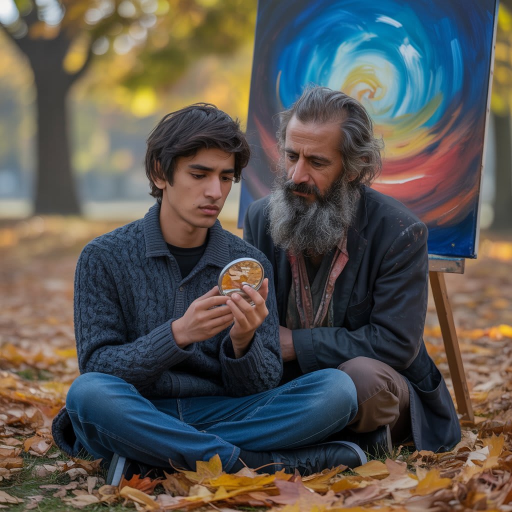 One autumn evening, while walking home from his work at a small bookstore, Ayaan noticed an old painter sitting near the edge of the park. The man’s clothes were worn, his beard untidy, but his canvas shone with strokes of dazzling colors—blue swirls that looked like the ocean, fiery reds bursting like sunsets, golden lights glowing like faith.