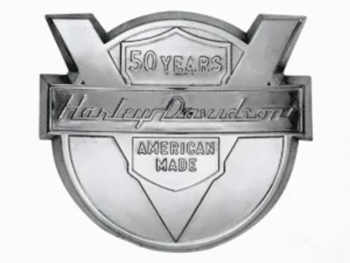 As Harley-Davidson celebrated its 50th anniversary in 1953, the logo underwent a significant redesign. This new version featured a circular design with an engraved "V" shape, accompanied by the company name in an italicized font. The logo also highlighted "50 years" at the top and "American Made" at the bottom, reflecting the company's pride in its heritage and its enduring American roots.