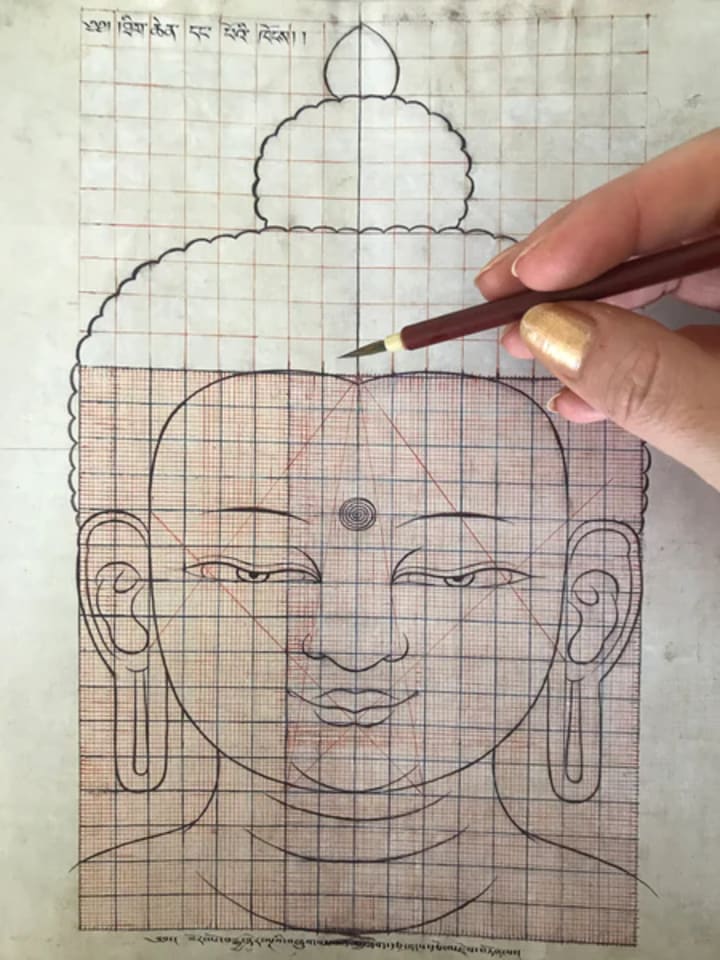 Once the surface is prepared, the artist sketches the design on the canvas using charcoal or pencil. This is where the real magic begins, as the intricate and symbolic designs begin to take shape. The deities are sketched exactly as per iconographic grids to ensure that the basic proportions of Buddha’s head and body are precise.
