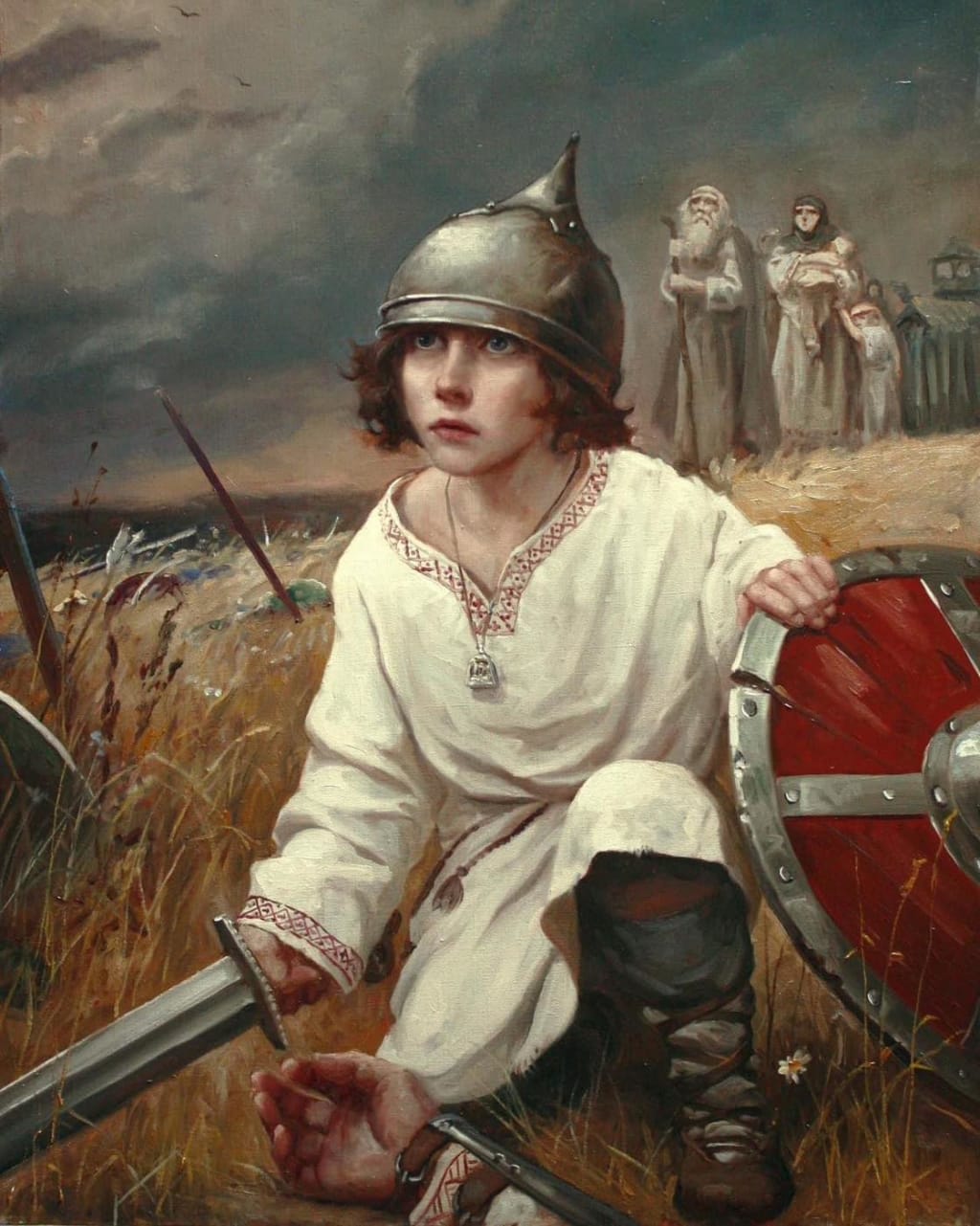 Shishkin’s painting brings forward the overwhelming burden of courage that often falls on those least prepared to bear it. The boy, still on the precipice of adolescence, was never meant to fight a battle of this magnitude. His childhood has been stripped away by the violence surrounding him, and now he must step into the shoes of a warrior, his hands too small to truly hold the weight of the sword. His father’s death, symbolized by the abandoned weapon at his feet, signifies the passing of the torch. The child, although not yet ready, has no choice but to become the guardian of his people.