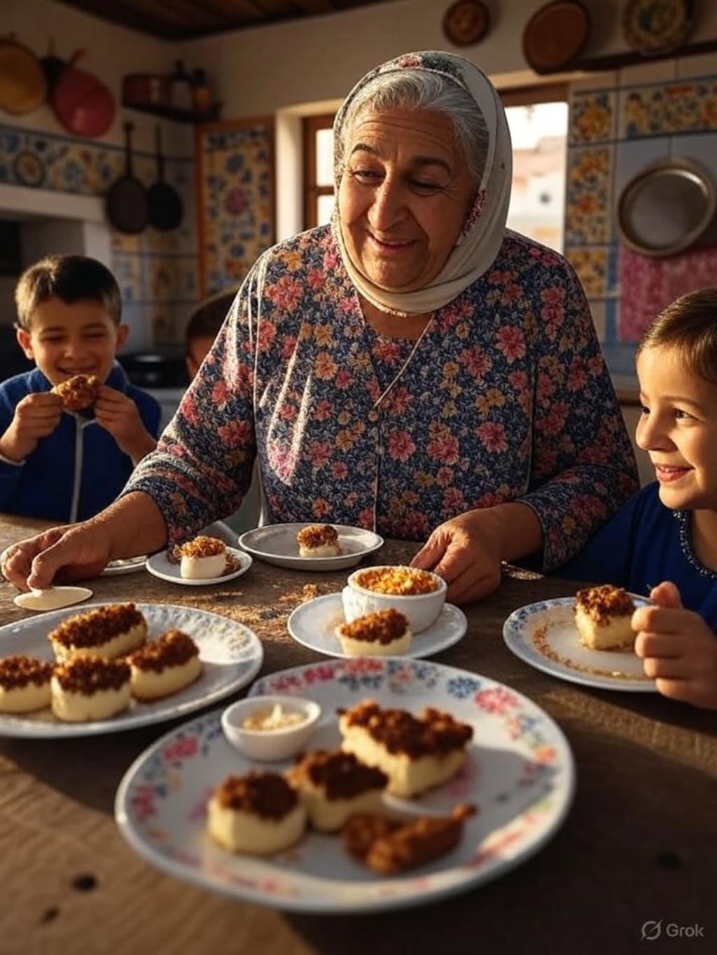 In a small village, there was an old woman named Umm Salem, famous for making the most delicious desserts. Every day, she prepared a new batch of golden basbousa or crispy kunafa and shared it with the village children. But there was a mysterious secret: anyone who ate her sweets would smile and laugh endlessly!One day, Yasser, a mischievous boy, decided to uncover Umm Salem’s secret. He sneaked into her kitchen at night and saw her adding a drop from a tiny bottle labeled "Joy Water" to the dessert. Curious, Yasser asked, "What’s that?" Umm Salem smiled and said, "These are my happy memories! I add them to the sweets, and they fill everyone’s hearts with joy."Yasser learned the secret but chose to keep it to himself. From that day on, whenever he ate Umm Salem’s desserts, he felt the world was brighter. He realized that happiness is made from love and cherished memories.