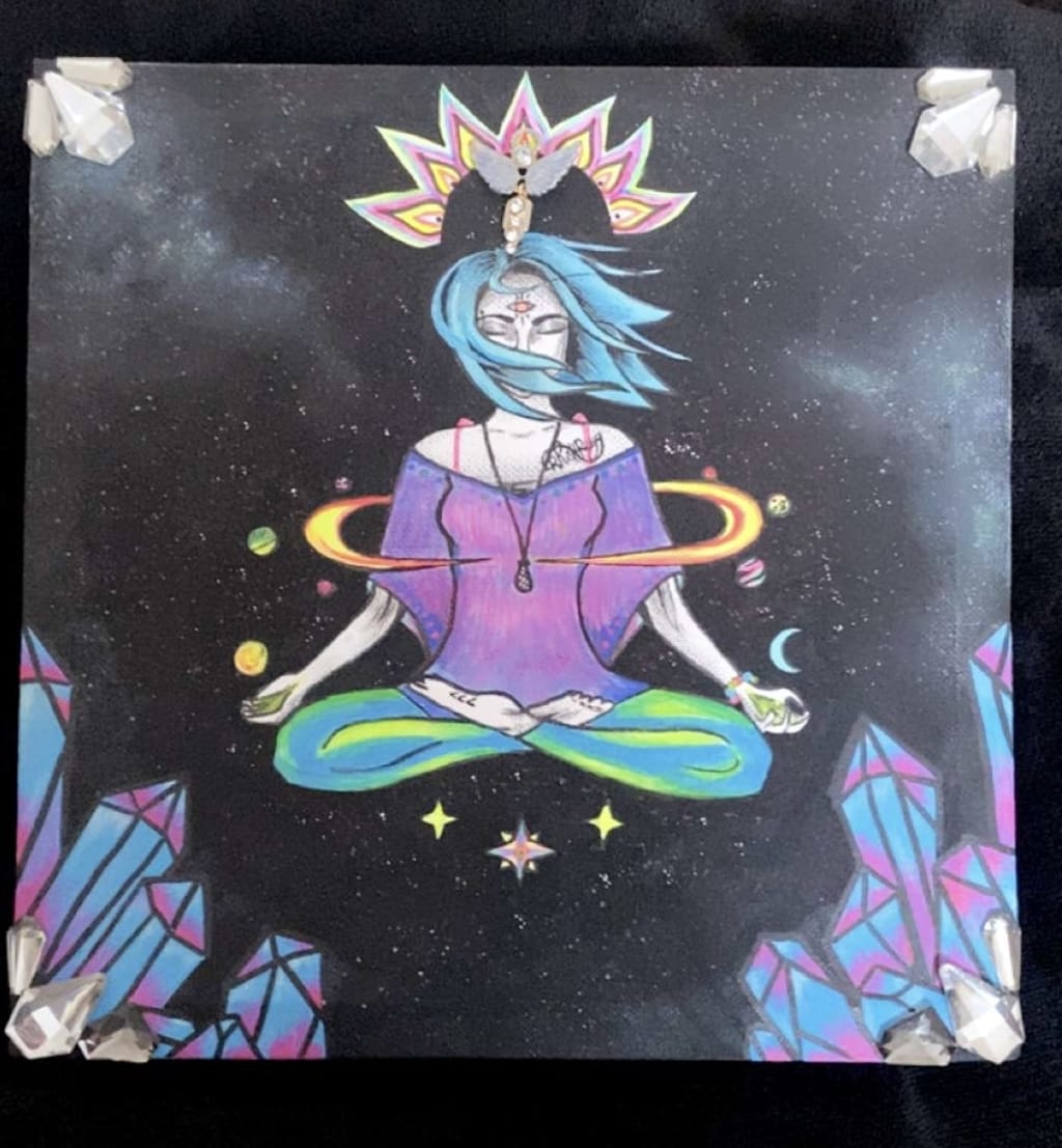 I have been going through a bit of a hair colour phase ever since I started working in the bar scene. (I don't think that is changing anytime soon either as I already have my next colour picked out) But, my hair was dyed blue at the time of the painting's creation so my friend painted my hair blue. She copied my style and also happened to include my tattoos and my very spiritual side which utterly melted my heart when I received the painting. I fawned over the piece instantly. I never owned something so beautiful before.