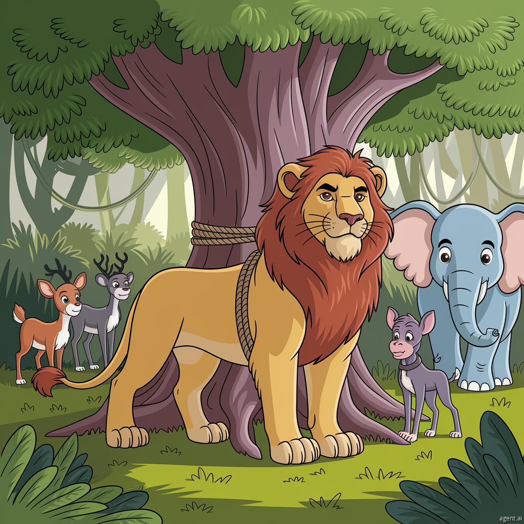 One hot afternoon, while Lion Layan rested under a tall fig tree, Rugo crept up silently with a thick vine in his mouth. With the help of some foolish followers, he tied the lion to the tree while he slept. By the time Layan woke up, it was too late — he was tightly bound.