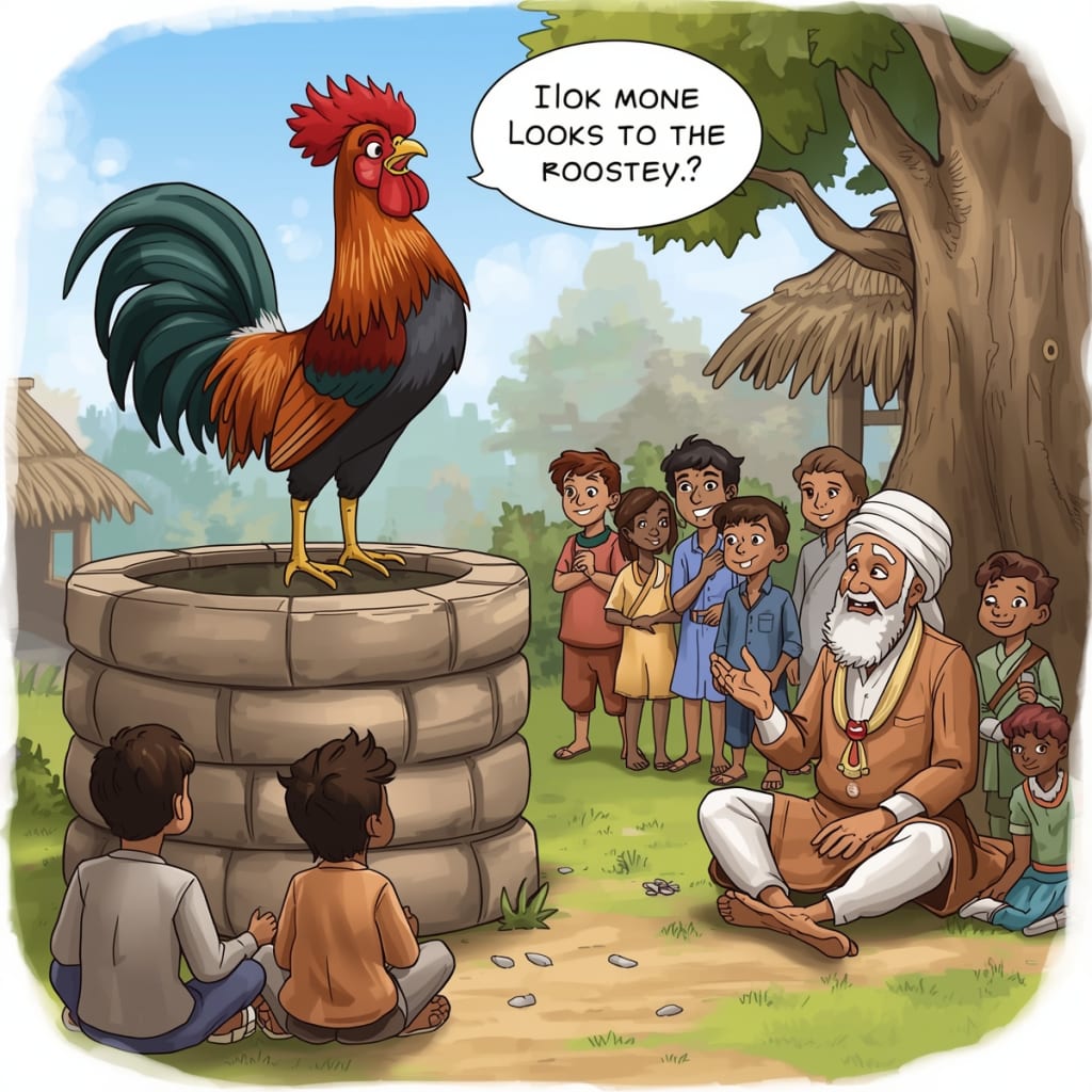 One evening, Surkhay stood on the top of the old well where villagers gathered every sunset. He crowed loudly—not the way he talked, but a traditional rooster call that immediately caught everyone’s attention. When the villagers settled down, he cleared his throat and spoke with seriousness.