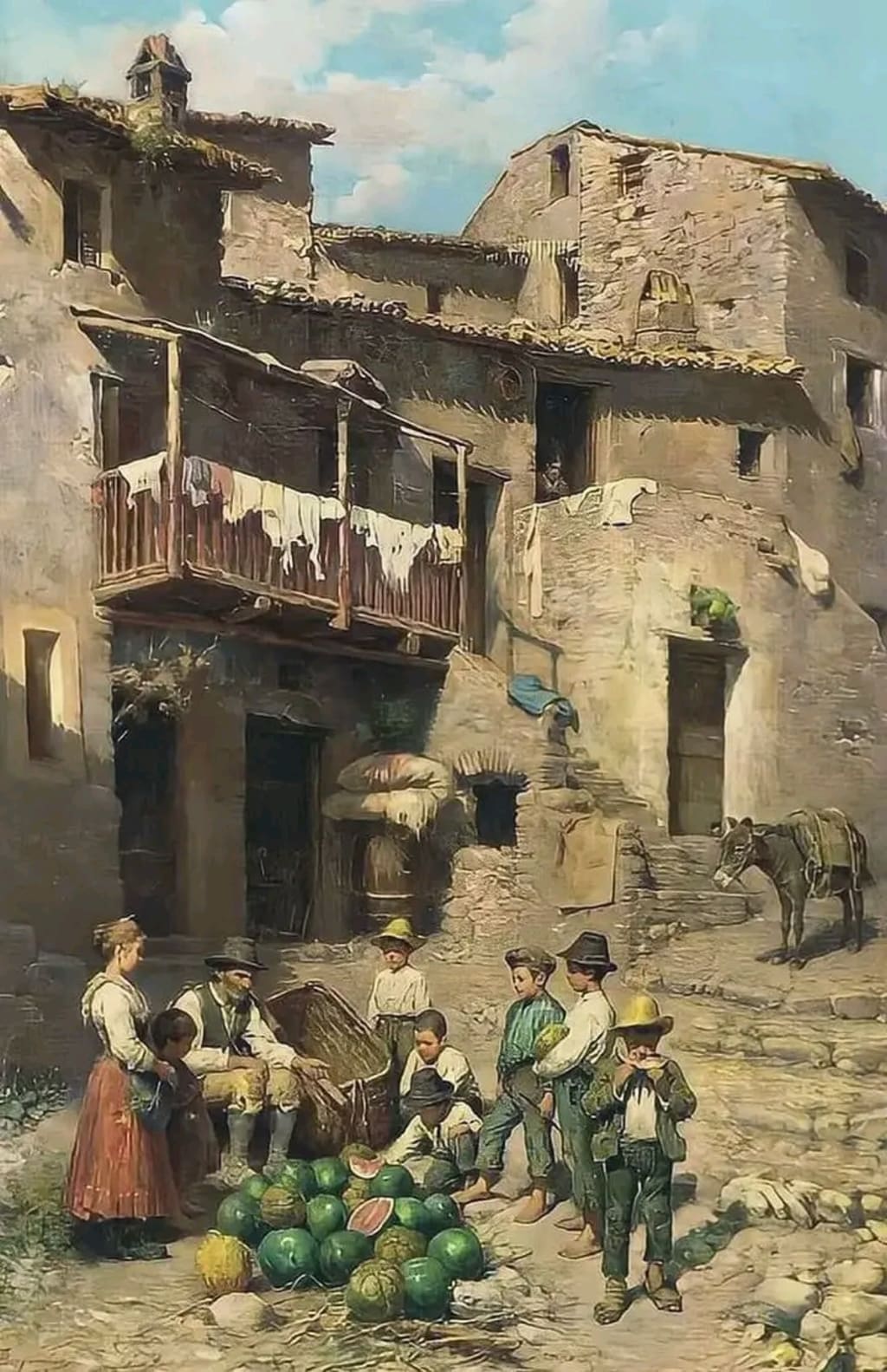 Francesco Bergamini (1815–1883), a celebrated Italian painter, was renowned for his ability to capture the essence of everyday life. His works are deeply rooted in the traditions of the 19th century, embodying the culture, emotions, and daily activities of the Italian people. Among his many masterpieces, The Watermelon Seller stands out as a vivid representation of rural commerce and community in Italy during his time. This painting is a testament to Bergamini’s remarkable talent for storytelling through art, where every brushstroke narrates a tale of hard work, simplicity, and human connection.