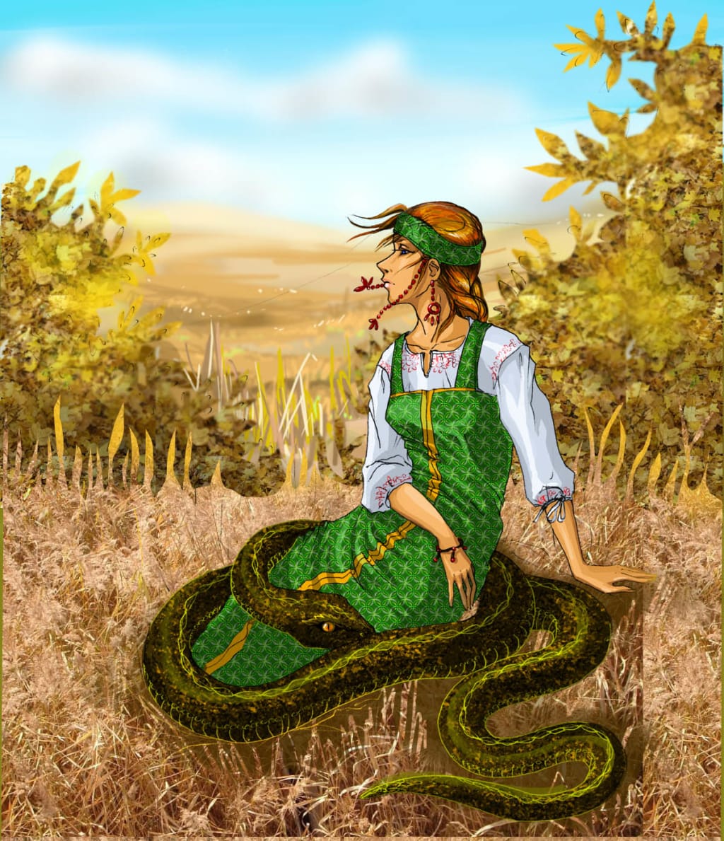 In a distant village, there lived an elderly widow who had three beautiful daughters. She toiled tirelessly, managing all the household chores herself, from fetching firewood to catching fish. One day, while attempting to catch fish by the river, she discovered a wicker basket containing a peculiar snake. Determined to rid her home of the creature, she brought the basket back and left it in a corner. Unknown to her, the snake ventured to a jar of condiments.