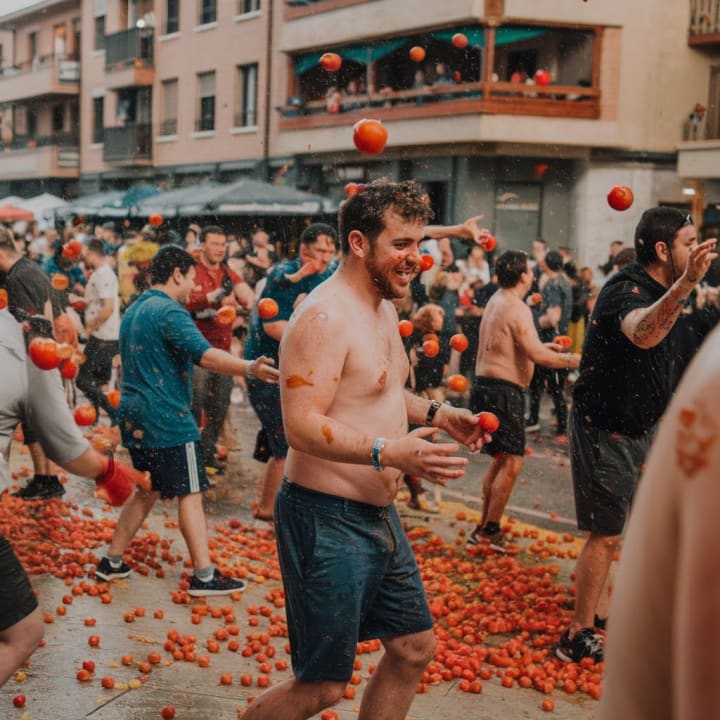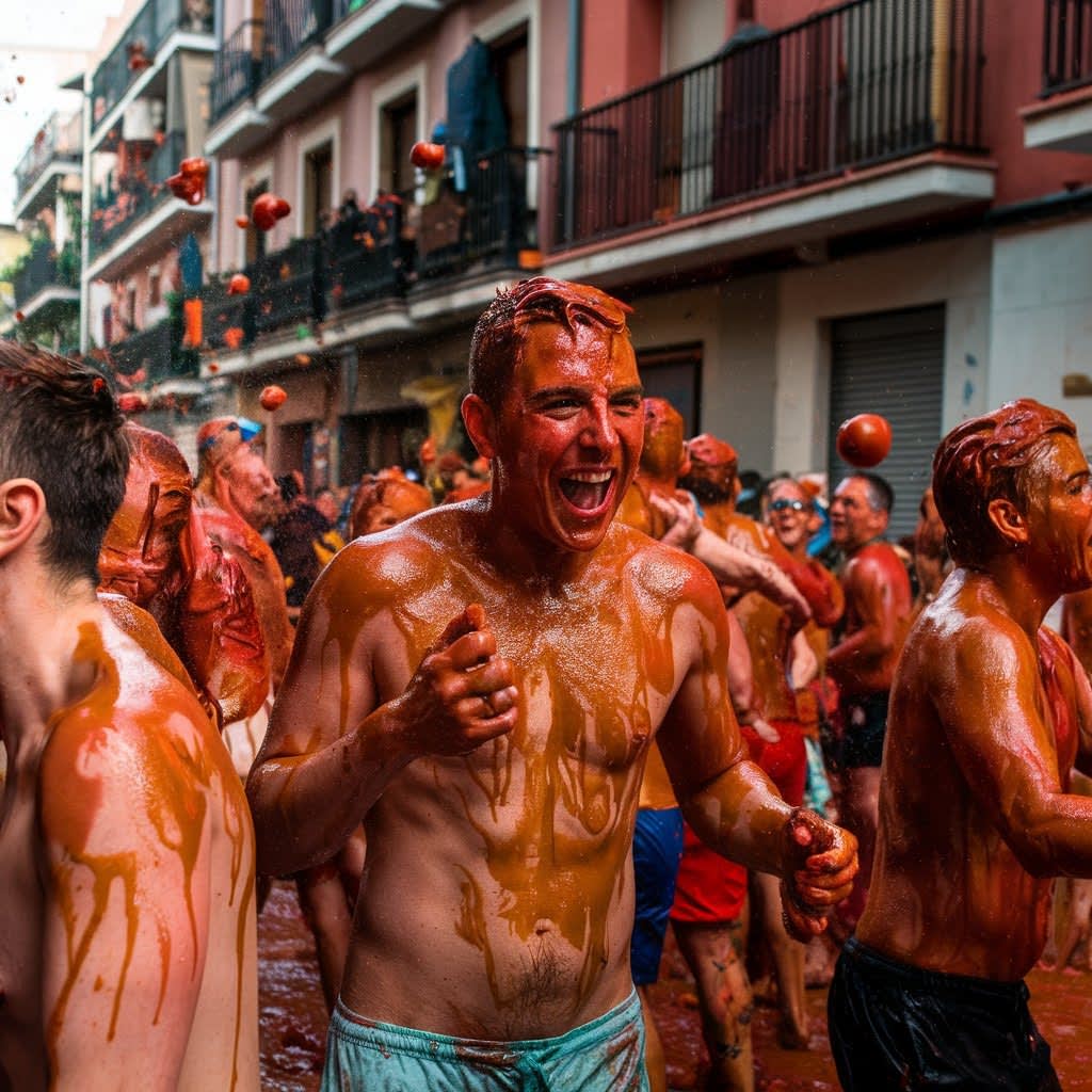 Imagine thousands of people covered in red pulp, slipping and sliding through the streets as tomatoes fly through the air.
