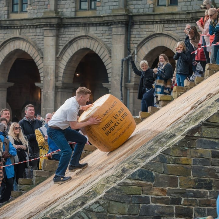 Picture a nine-pound wheel of cheese rolling down a dangerously steep hill, followed by a crowd of people tumbling after it.