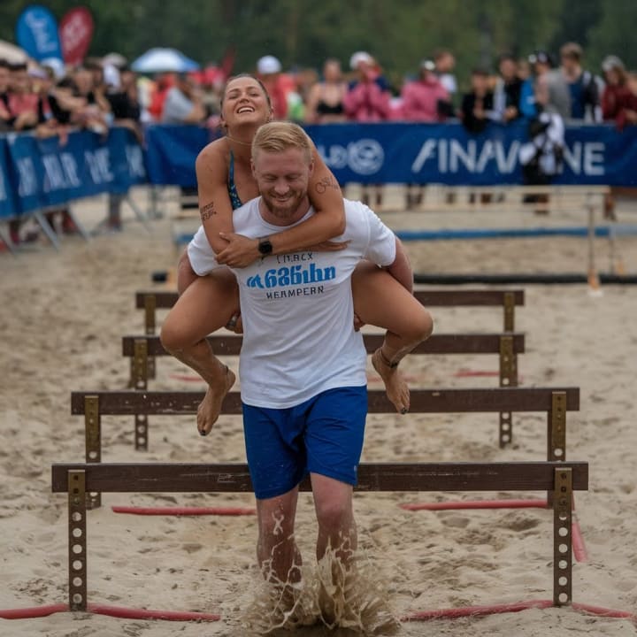 Husbands sling their wives over their shoulders and dash through an obstacle course that includes water traps and hurdles.