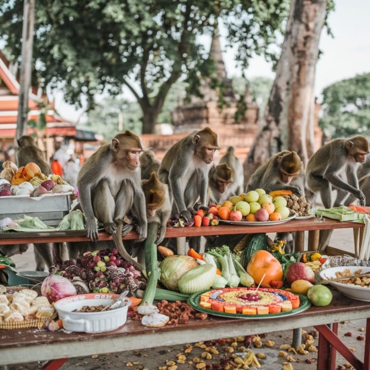 A lavish banquet laid out for monkeys—yes, actual monkeys.