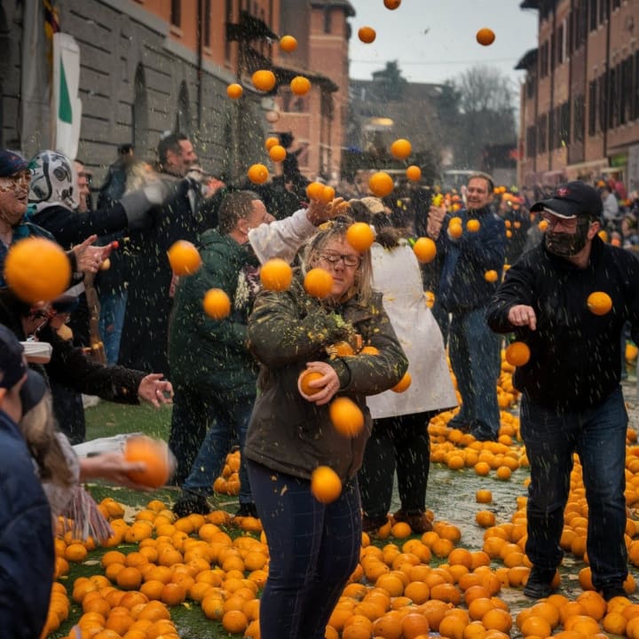 Participants in Ivrea split into teams and pelt each other with citrus fruit, symbolizing a medieval revolt against tyranny.