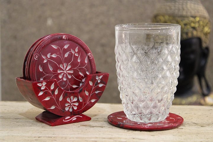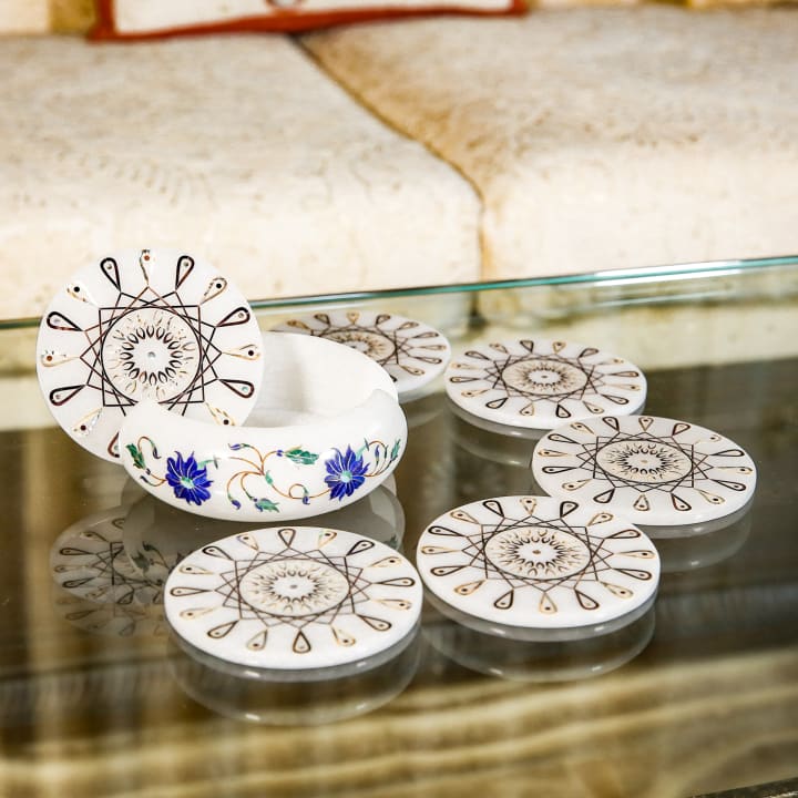 While malachite brings gemstone charm, the Marble Inlay Coaster Set adds traditional Indian craftsmanship to the mix. These coasters are crafted from pristine white marble and adorned with intricate inlay work using semi-precious stones—sometimes even featuring malachite itself.