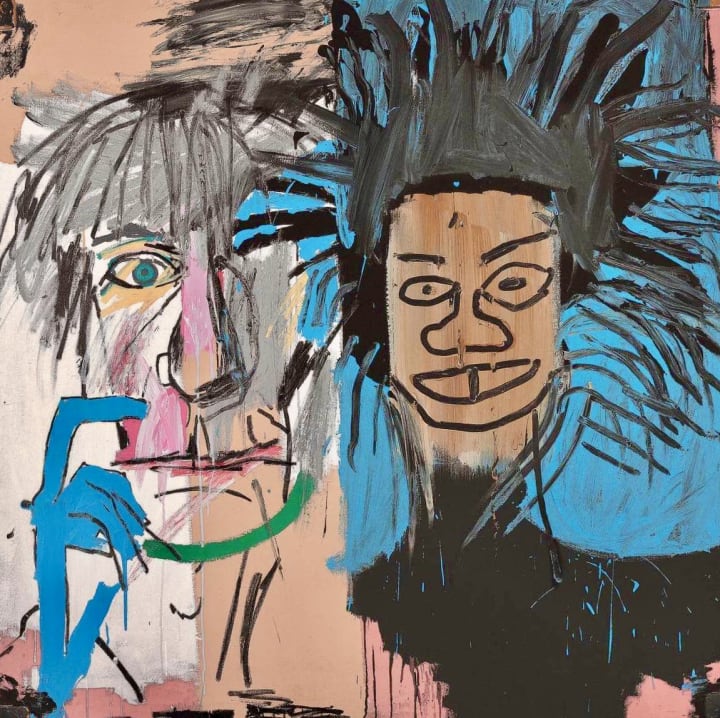 One of the most iconic collaborations in Basquiat’s repertoire was his partnership with the legendary Andy Warhol. The unlikely duo, brought together by a mutual fascination with art, fame, and celebrity culture, created a series of groundbreaking works that captured the zeitgeist of 1980s New York. Basquiat’s raw, primal energy collided with Warhol’s cool, detached aesthetic, resulting in a fusion of graffiti, pop art, and street culture that defied categorization. Pieces like “Dos Cabezas” and “Ten Punching Bags (Last Supper)” exemplify the dynamic tension between Basquiat’s streetwise sensibility and Warhol’s polished sophistication, offering a glimpse into the cultural crosscurrents of the era.