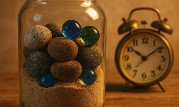 Professor Eliot stood at the front of the classroom, a large empty glass jar in front of him. The students watched with mild curiosity. It was their last class before graduation—a philosophy elective most took for easy credit. But today, the old man had no books, no projector—only a jar, a small bucket of big rocks, a bowl of pebbles, a handful of sand, and two cups of coffee.