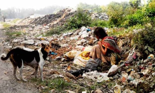 Amidst the Beastly Crowd, Searching for Humans" _______By Aranna Hasan Delwar. A man is scavenging food from a trash bin