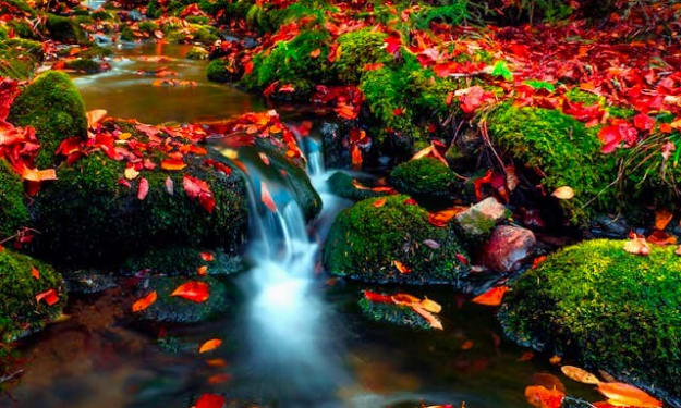 Redolent, bright leaves Cascade in sprightly colors Sating autumn’s need