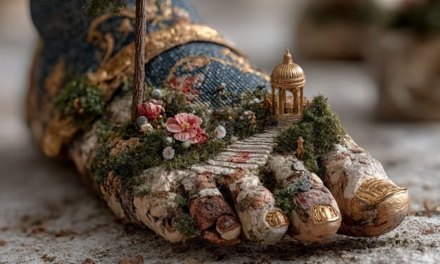 My foot is stuck in a garden. Not just any garden—one carved into the skin and bone of you, where wildflowers curl over your bruised toes and a golden path winds past your ankle to a domed pavilion no bigger than a thimble. I had to laugh at the absurdity. Of course I’d find myself here, motionless, the past blooming like moss between the cracks.