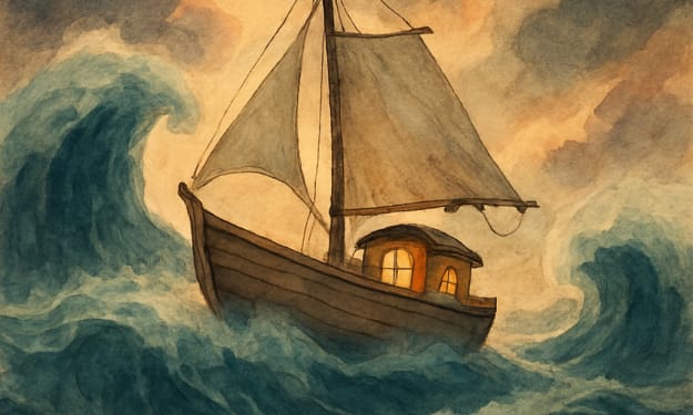 A ship, not grand, but brave and worn, With sails once white, now frayed and torn, Left harbor under silver skies With hope that quiet seas imply.