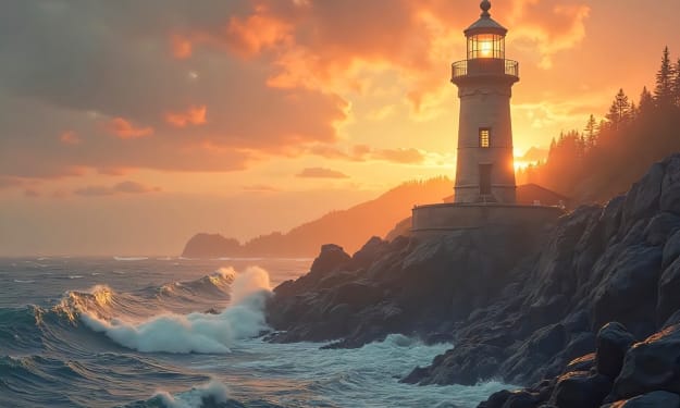 At the edge where the land meets the sea, Stands a tower watching silently, Its lantern swings with a gentle grace, Searching the dark for a long-lost face.