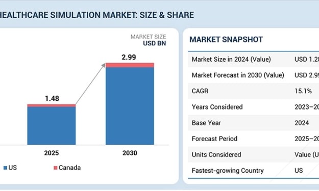 The North America healthcare simulation market is entering a decisive growth phase as healthcare systems, academic institutions, and regulators intensify their focus on patient safety, workforce readiness, and technology-enabled training. Valued at US$1.28 billion in 2024 and US$1.48 billion in 2025, the market is projected to expand at a robust CAGR of 15.1% from 2024 to 2030, reaching an estimated US$2.99 billion by the end of the forecast period.