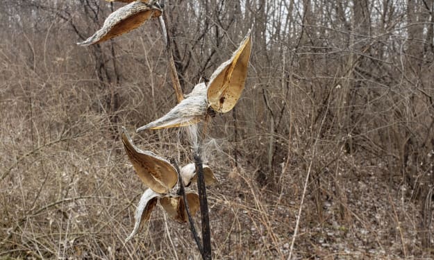 I paused to look at last year’s milkweed, it’s pods open and emptied. The stalk, dry and dead. A few seeds remained, clinging to the plant.