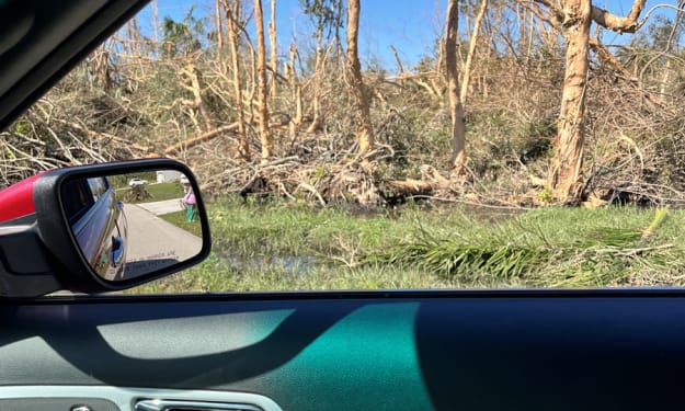 WHERE ARE WE … did I take a wrong turn … The street was not familiar. Oh heck! Forget the street! The town looked foreign to me. We’d only been gone two days. We were so sure we took the correct route, and yet, what we saw was nothing like what we remembered. Where were the lush palm trees? The tall and fragrant cedar trees? The beautiful magnolias? The once-beautiful green grass was now littered with all sorts of debris. There were no street signs to indicate where we were.